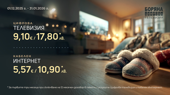 * За първите три месеца при сключване на 12 месечен договор в пакети с услугите Цифрова телевизия и Кабелен Интернет.